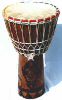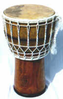 Tamburo tubolare a clessidra originario dell'Africa Occidentale, in particolare Mali, Burkina Faso, Senegal, Costa d'Avorio e oggi diffuso in tutto il mondo. Il djembč, costruito da un frammento di tronco d’albero sottile e scavato, č composto da un calice in legno ricoperto di pelle di capra o piů raramente di mucca e da un sistema di tiraggio della pelle stessa, formato da corde e da cerchi metallici. Viene suonato a mani piene e ha tre colpi principali, lo slap (suono acuto), il tone (suono medio) ed il base (suono basso). Si tratta di uno strumento che viene raramente utilizzato in solo ma che si suona insieme ad altri tamburi e ad altri strumenti, che vanno a costituire la poliritmia, stabilendo attraverso le composizioni ritmiche, dei momenti di assolo per ogni tamburo. |