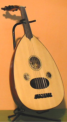 Membro della famiglia dei liuti a manico corto, con cassa piriforme provvista di tre fori decorati a rosette e privo di tastatura. L'Oud è considerato dagli arabi il sultano degli strumenti musicali ed è diffuso in tutto il mondo arabo-islamico, è talmente importante che l'intero sistema armonico arabo si basa sulla posizione della mano sinistra sul manico dell'Oud. Il numero delle corde è variabile, solitamente sono 11 distribuite in 5 coppie con la stessa accordatura più un bordone singolo; in passato erano di seta o di budello, attualmente sono per lo più di nylon. Il tipo di accordatura dipende dal genere suonato e dalla provenienza turca o maghrebina. |